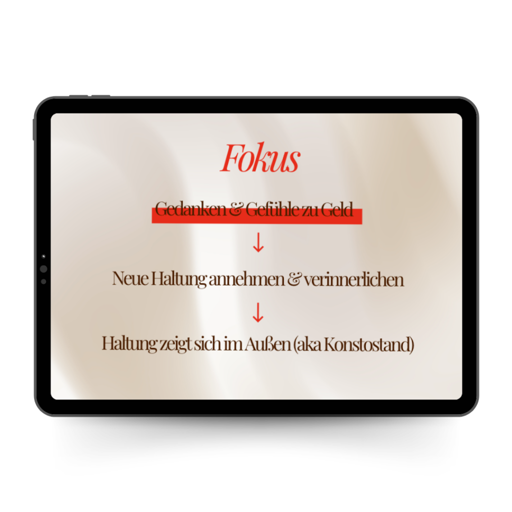 Die ersten 60 Minuten bestehen aus einem Teaching-Teil, bei dem du die Steps zu einer neuen, bewussteren Haltung zu Geld kennenlernst.